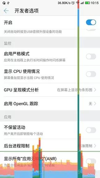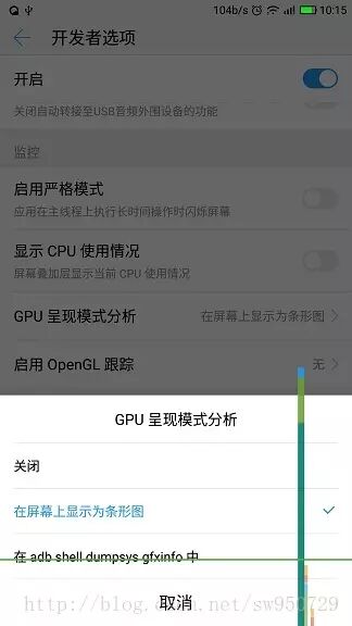 我们依旧打开设置–>开发者选项–>GPU呈现模式分析–>在屏幕上显示为条形图,如图所示: