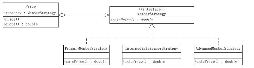 假设现在要设计一个贩卖各类书籍的电子商务网站的购物车系统。一个最简单的情况就是把所有货品的单价乘上数量,但是实际情况肯定比这要复杂。比如,本网站可能对所有的高级会员提供每本20%的促销折扣;对中级会员提供每本10%的促销折扣;对初级会员没有折扣。