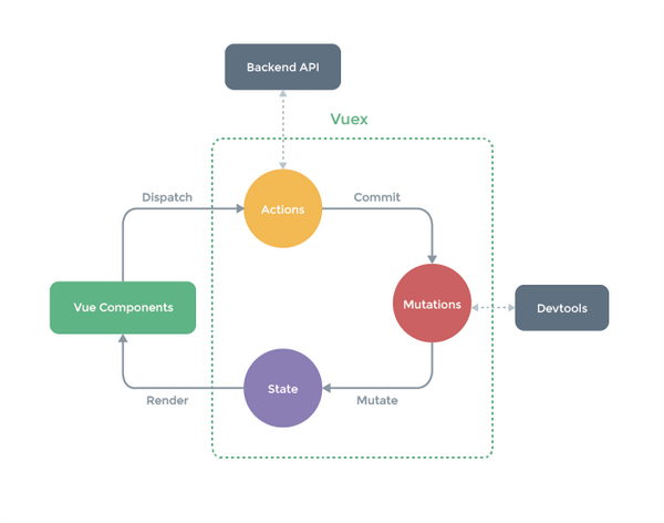 <img src="https://pic1.zhimg.com/v2-96cb87f73f32562dfbe95e63e6abeac0_b.png" data-rawwidth="701" data-rawheight="551" class="origin_image zh-lightbox-thumb" width="701" data-original="https://pic1.zhimg.com/v2-96cb87f73f32562dfbe95e63e6abeac0_r.png">从左到右,从组件出发,组件中调用 action,在 action 这一层级我们可以和后台数据交互,比如获取初始化的数据源,或者中间数据的过滤等。然后在 action 中去派发 Mutation。Mutation 去触发状态的改变,状态的改变,将触发视图的更新。