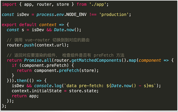server.js 返回一个函数,该函数接受一个从服务端传递过来的 context 的参数,将 vue 实例通过 promise 返回。 context 一般包含 当前页面的url,首先我们调用 vue-router 的 router.push(url) 切换到到对应的路由, 然后调用getMatchedComponents 方法返回对应要渲染的组件, 这里会检查组件是否有 preFetch 方法,如果有就会执行它。