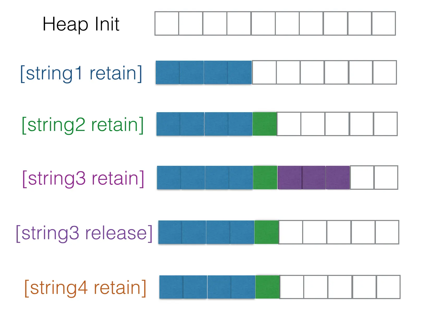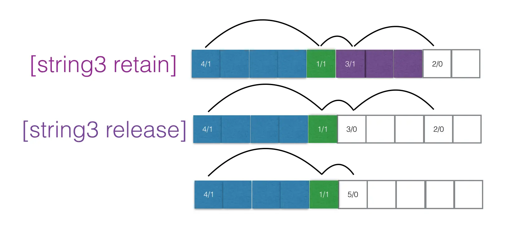 Release 的操作除了分配内存空间,还要注意整合内存块。我们刚才那个例子,当 [string3 release]之后,它分配出来的内存块会和空余的整合在一起。这个过程如下所示: