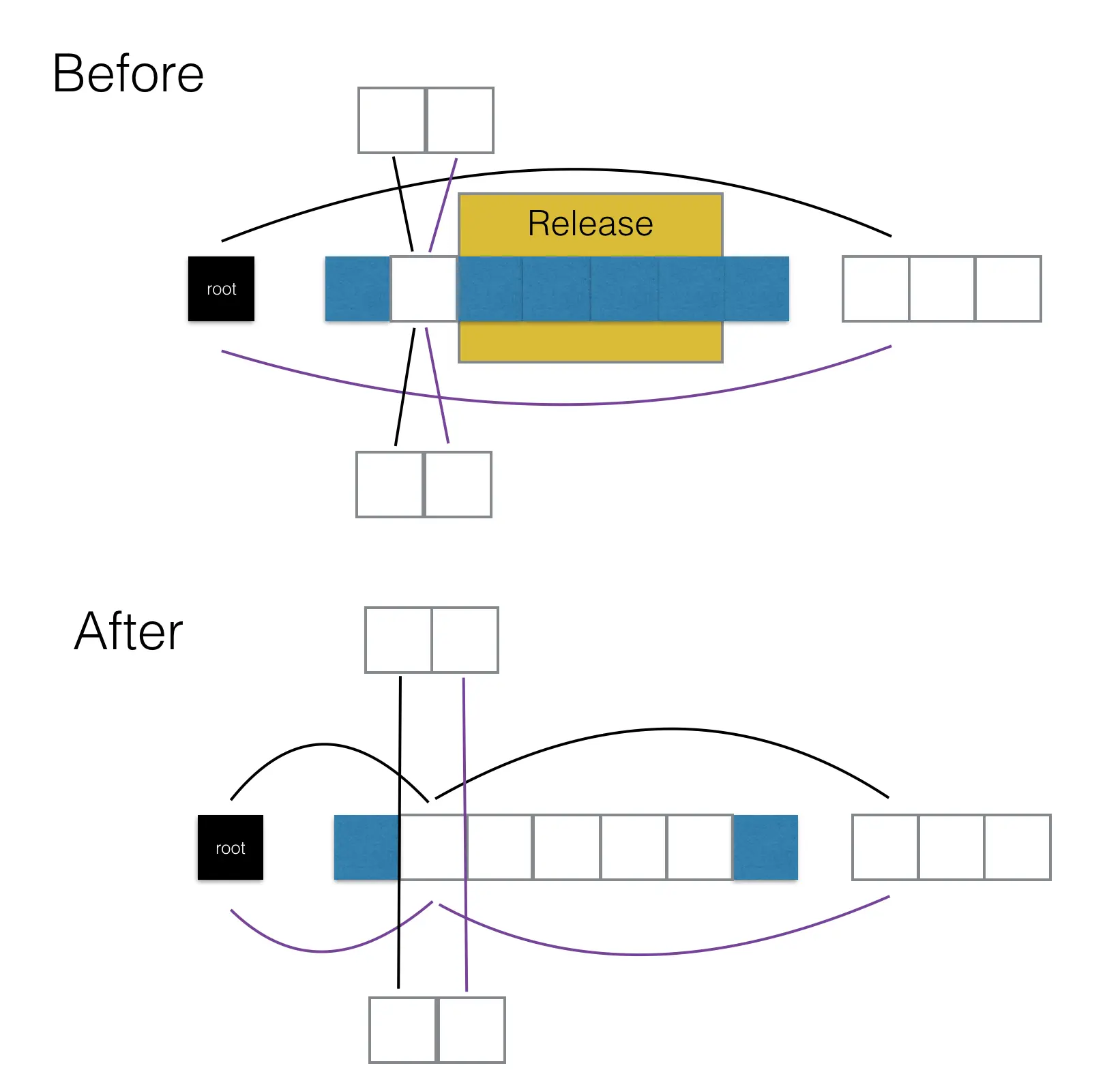 这样每次 retain 操作,我们可以少遍历一半的内存(已经分配的),效率理论上来讲提高一倍。而 release 操作,我们可以采用 LIFO 机制,将多出来的空余空间插入到 Heap 头处,并与原来的第一个空余空间整合。这样的做法复杂度是常数,非常高效。最后,我们再也不用花多余的精力去用 1 和 0 来表示当前内存块是否为空。