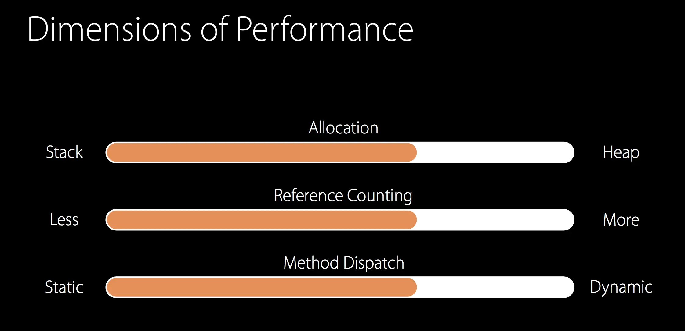 虽然现在苹果已经用 ARC 帮我们自动处理内存分配和释放的问题了。相比于 MRC 时代手动的 retain 和 release 操作,我们无需过度担忧内存调度。然而,在优化方面,苹果推荐 Stack 和值类型,是因为 Stack 的性能很高,复杂度几乎为常数。虽然 Heap 在动态内存分配中似乎更自由、更灵活,但相对而言,其性能很低,复杂度较高。所以,Swift 的值类型才如此受欢迎啊。