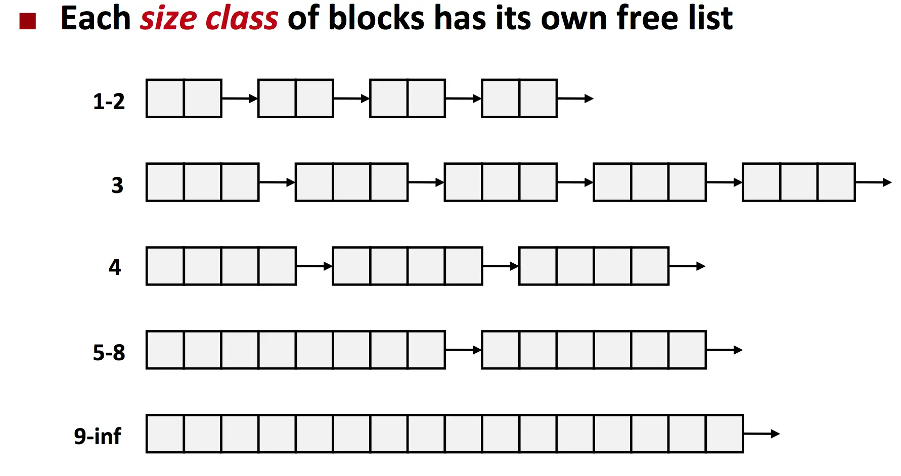 为了提高空间利用率,我们还可以引入数组。数组中的每一个元素都是一个双向链表。每一个双向链表连接了 Heap 中的大小相近的空余空间。这样我们在 retain 的时候,我们先根据大小快速定位到比较合适的空余空间所在链表,再做遍历。如此一来,空间利用率得到提高,遍历元素数量减少,Heap 效率更高。