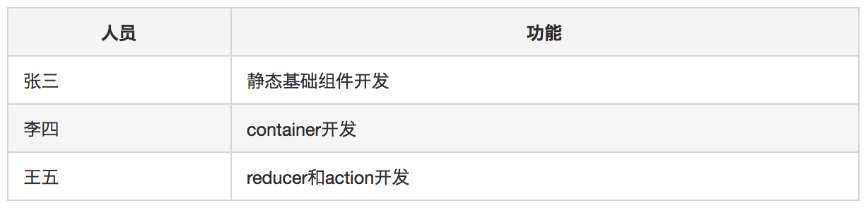 这个分工让张三和李四逃出了 PM 和 BD 的魔爪,让王五一个痛苦去吧。但是呢,来自 UI 的压力也基本被张三和李四分担了。这个已经很合理了吧,还有优化空间?咱们仔细看一下。 王五是比较累的,因为张三和李四分担了他的不同的功能组件。他在整合业务会和这两人同时打交道。那再来个 Redux?