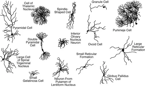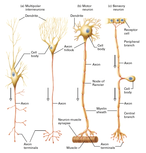除此之外还有另外两种神经元:感觉神经元(sensory neuron)和运动神经元(motor neuron)——它们是通向脊髓和组成周围神经系统的神经元。这些神经元的长度可以达到 1 米。下面是各种神经元的典型形态。