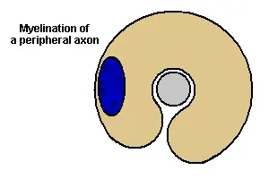动作电位的传递速度为每秒 1 到 100 米之间。之所以会有这么大的变动范围,部分原因是神经系统中的另一种细胞——施旺细胞(Schwann cell)——它像是一位总觉得孙子穿不够的老奶奶,一直往轴突身上盖一层层厚厚的毯子——髓鞘(myelin sheath)。整个过程就像这样: