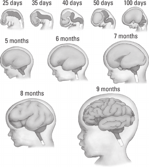 于是我们在进化过程中找到了一个取巧的办法。因为皮质非常薄,所以它的生长是通过增加表面积来实现的——它会形成很多皱褶(包括向下延伸到左右半球之间空隙里面),这样你就能在不增加太多大脑容量的前提下得到超过三倍的大脑表面积。当大脑开始在子宫内发育时,它的表面还是光滑的——这些褶皱大多在孕期的最后两个月才会出现。