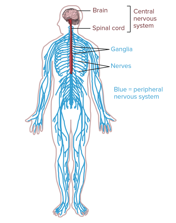 神经系统分为两个部分:中枢神经系统(你的大脑和脊髓)和周围神经系统(由从脊髓向身体其他部位发散的神经元组成)。