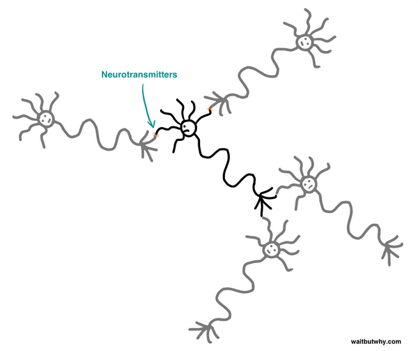 当出现这种情况的时候,一股电流会从他的身体(轴突)流向他的脚(轴突末梢,axon terminal),后者会因此碰到其他小人的头发(这个接触点叫做突触,synapse),在这个过程中,小人身体的电荷会从负电短暂转变为正电,然后迅速回到他正常的负电位状态。当这个动作电位到达小人的脚时,轴突末梢会释放化学物质到它正在触碰的头发上,这样有可能会导致被触碰的小人受到电击,正如他之前所遭遇的情况。