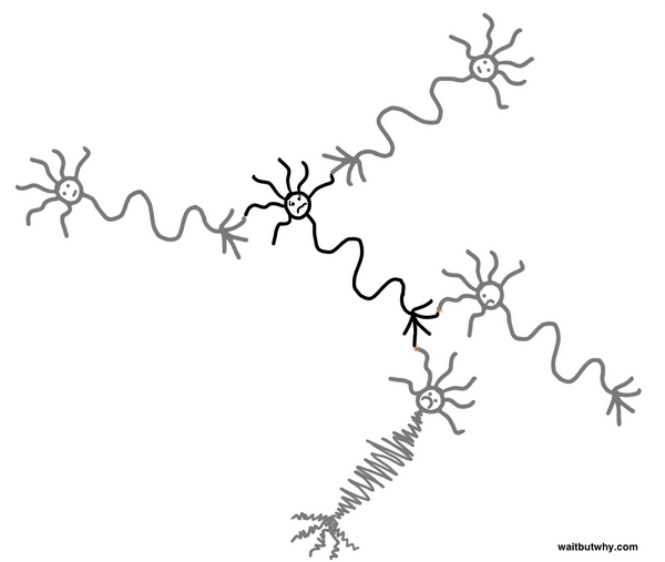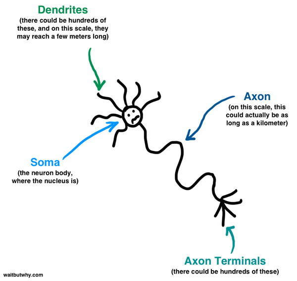 然后给他多加几条腿和一些头发,把胳膊卸掉,最后再把他拉长——这样我们就画出了一个神经元。