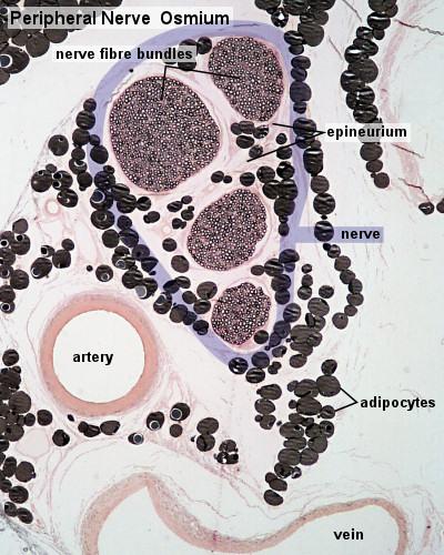 图中被紫色圈出来的部分就是一条神经的截面,里面的四个圆形就是无数被捆在一起的轴突(这里有一个更为生动的图示)。