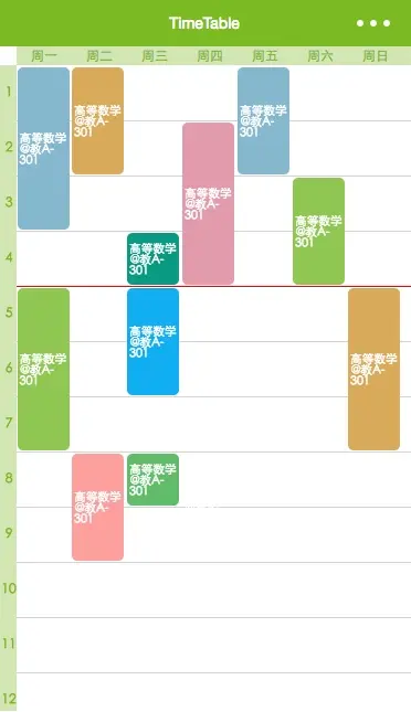 </view>这里就是用微信的list,然后通过绝对定位,算出margin-left和margin-top,以及根据节次算出height即可,至于背景颜色,遍历一个数组来获得不同颜色,并通过border-radius: 5px;来设置圆角。