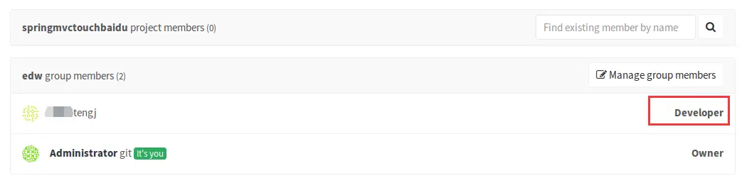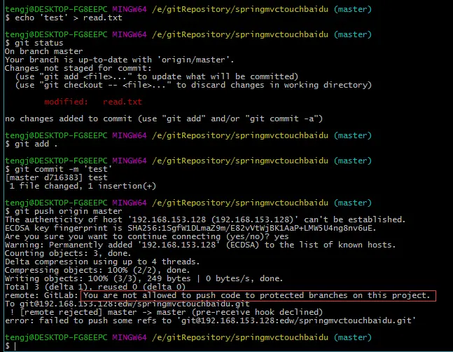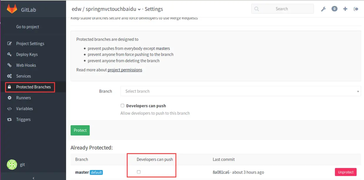 比如我添加tengj用户的时候选择的是Developer角色,只要在Protected Branches中这个勾不够上就行了。这样开发人员就无法push代码到master分支上。