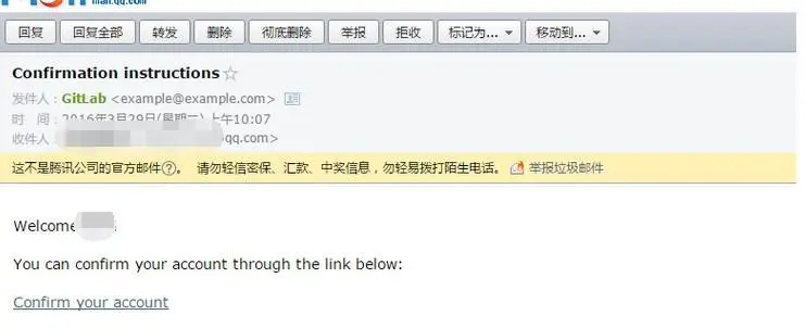 配置好了邮箱,就要测试一下,我们在http://192.168.153.128/users/sign_in 首页,注册一个额用户,然后我收到邮件激活,然后就可以登陆系统了。