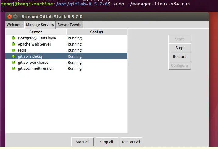 ./bitnami-gitlab-8.5.7-0-linux-x64-installer.run执行后就会弹出图形化界面,一步步确认就行,如下图