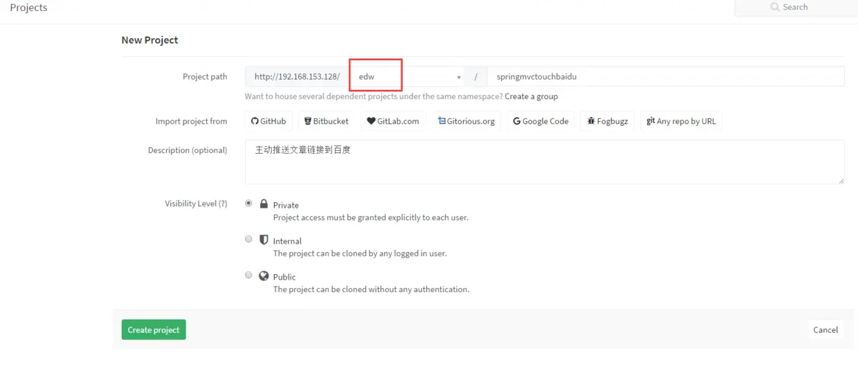 小组创建好了就可以新增一个项目了,这里创建的时候选择edw这个创建好的小组,并且项目宣称private私有项目。这样只有小组内的成员可以下载这个项目