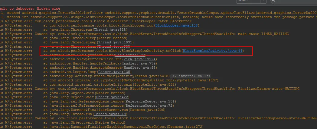 - Step6. 回调OnBlockListener,以及选择保存当前进程中所有线程的堆栈状态到SD卡等;