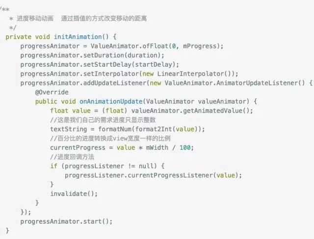 进度条画完之后就是让它动起来,我们使用属性动画试试改变当前进度的值重新绘制就可以了,动画效果我们继续使用ValueAnimator