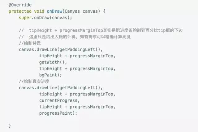 因为我们是自定义view,看到的所有元素都是在onDraw里边绘制出来的,分析进度条效果我们可以分解出几个步骤,先绘制底层百分百进度条(也就是背景色),再绘制真实的进度。