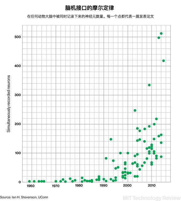 对于这个行业的发展潜力来说,这一步意义重大。我们现在的极限是几百个电极一次能够测量大约五百个神经元,离一百万这个数目可以说很远也可以说真的很近——这取决于接下来的增长模式。如果每过十八个月,我们就往这个极限数目上增加五百个神经元,到 5017 年我们会达到一百万这个目标。如果我们每过 18 个月就能把总数翻一倍,就像在计算机晶体管上实现的一样,到 2034 年我们就能达到一百万这个数字。