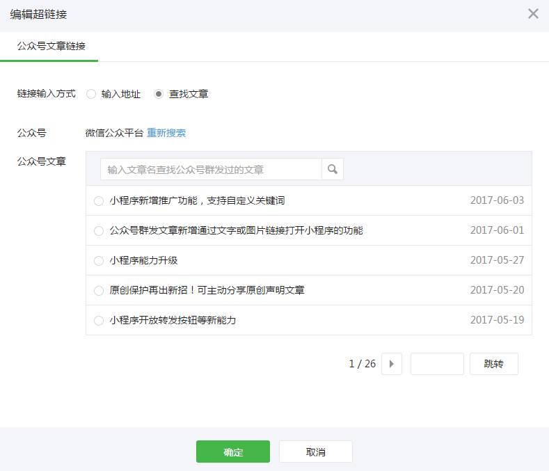 选择“查找文章”,默认展示自己帐号已群发的文章列表,可搜索其他帐号的已群发文章。