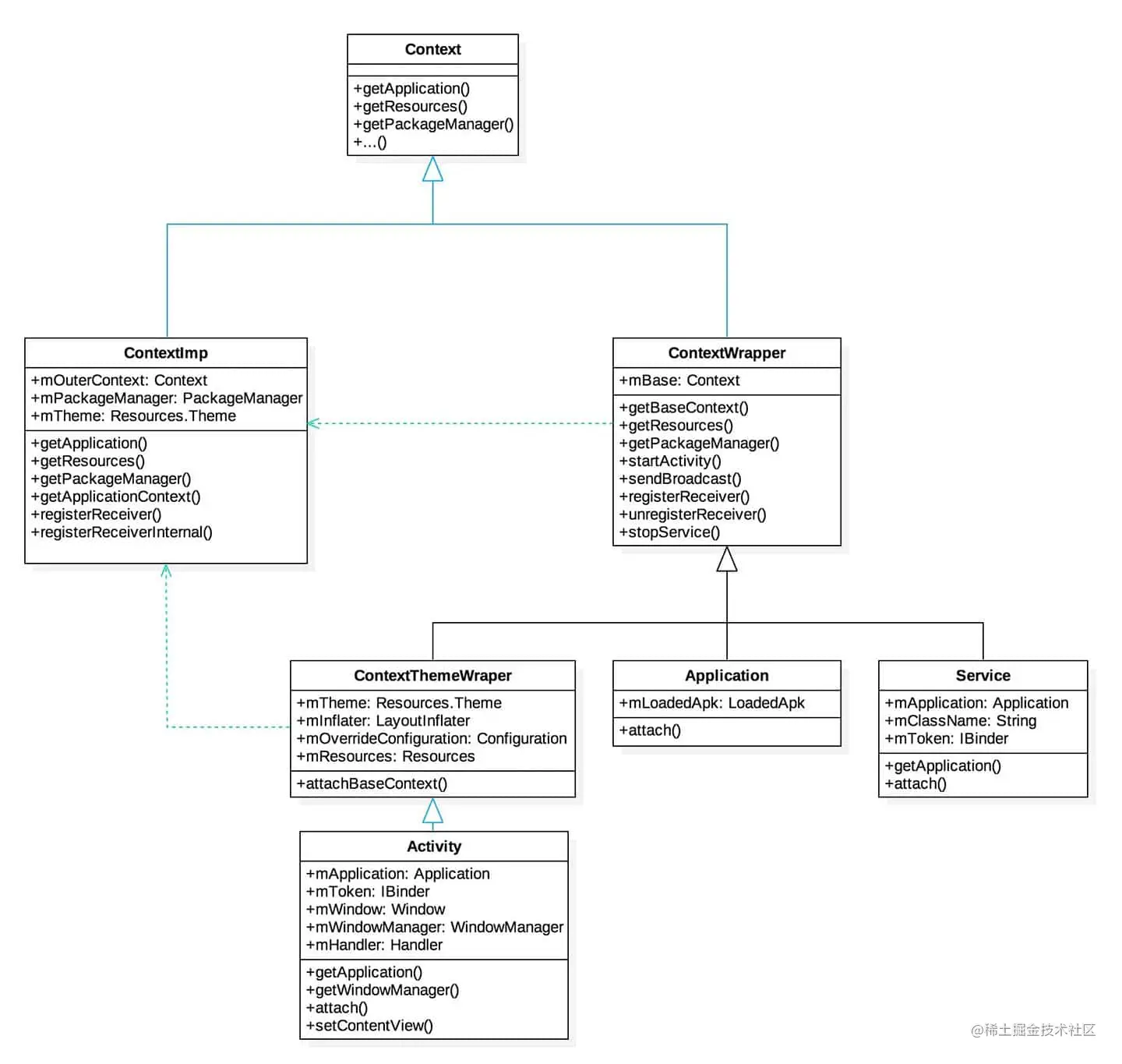 上面方法是在LoadedApk类中调用的,我们先不分析这个类,后续我们会详细讲这个过程,我们先分析上面这段代码,我们看到这里面通过调用ContextImpl.createAppContext方法来创建ContextImpl,然后将参数传入newApplication方法,因此我们看到上面的mBase就是ContextImpl,那么还有Activity和Service.我们先分析Service,因为从关系图可以看到Service和Application都是直接继承ContextWrapper,而Activity则是继承ContextThemeWrapper,ContextThemeWrapper继承ContextWrapper。