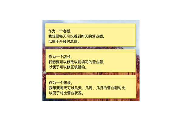 用户故事有三个要素,<角色>、<活动>、<商业价值>,直白地说就是“谁”,“干什么”,“有什么用”。编写用户故事,可以让我更清晰地站在不同的视角来分析产品需求。