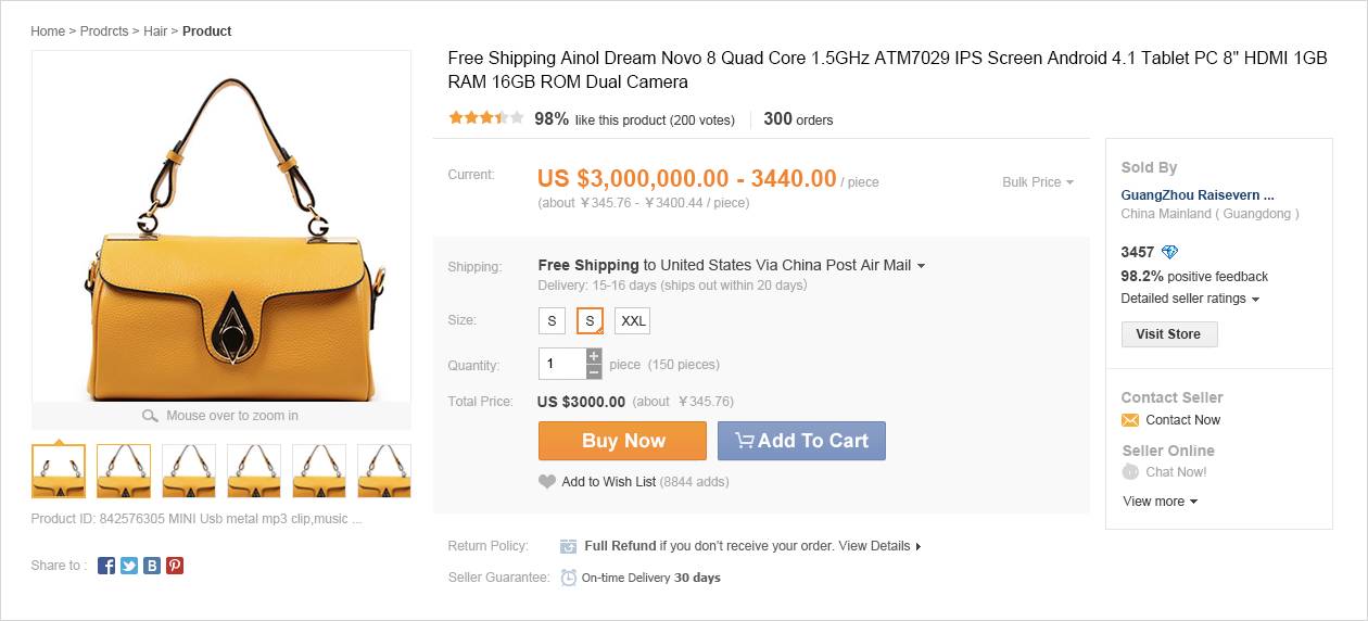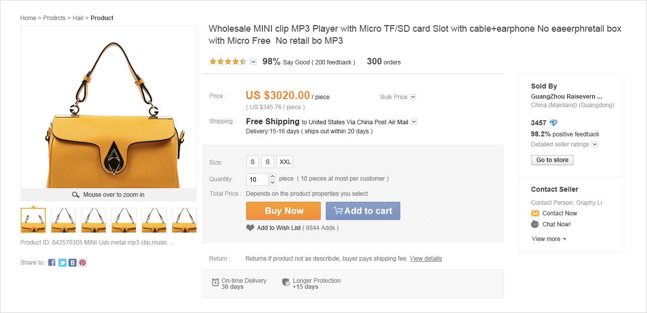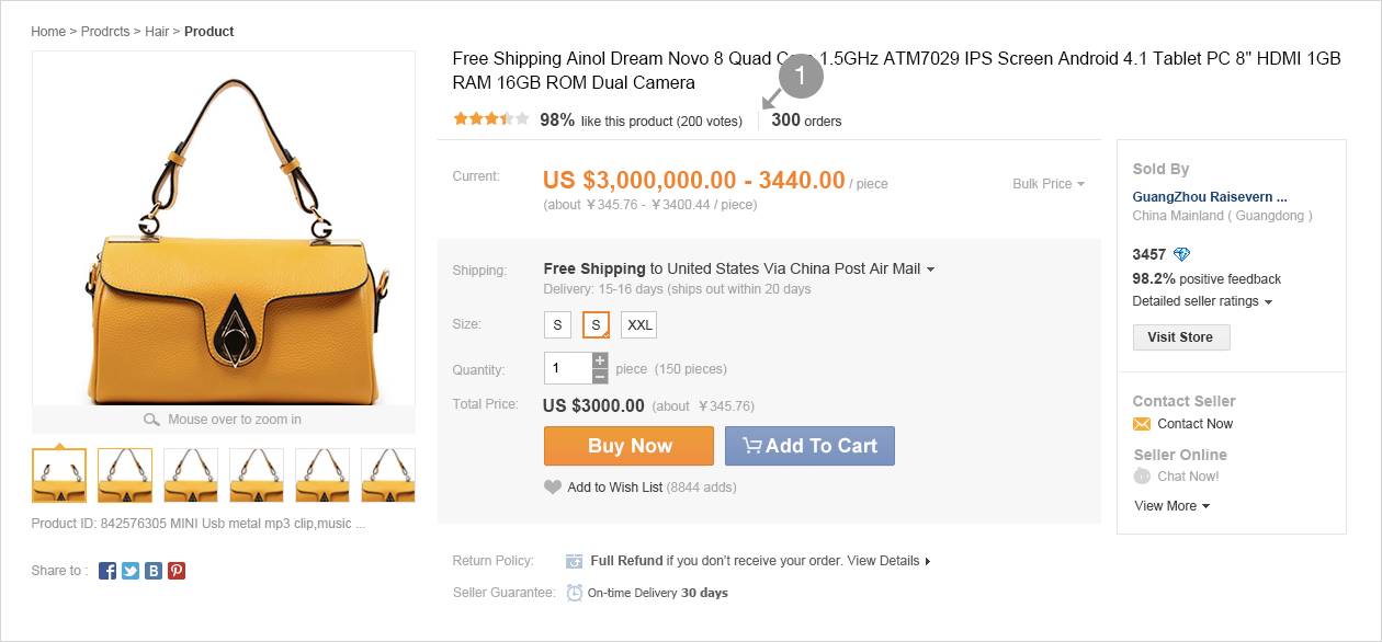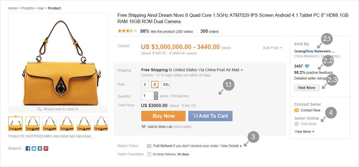 3 retum policy:第3梯队的信息处理起来就更容易了,包括面包屑、还有店铺相关的detailed seller ratings等信息,都用了最简单处理手法,颜色为黑灰色,字号为12px;