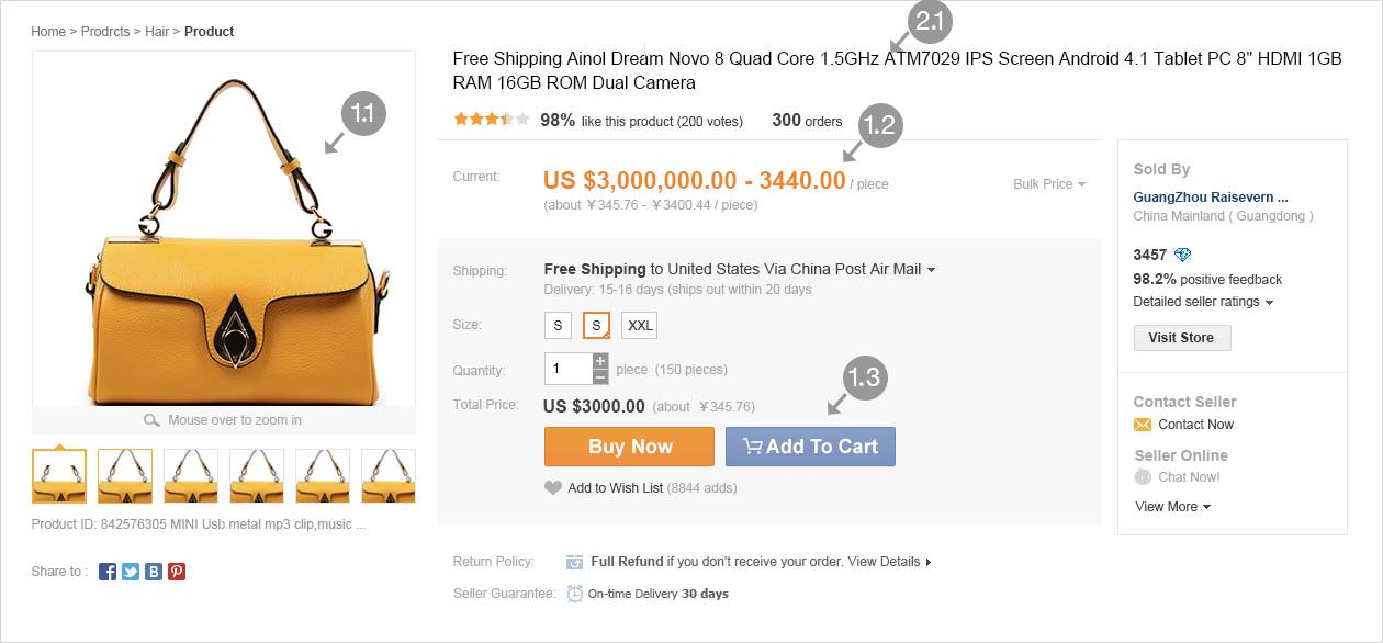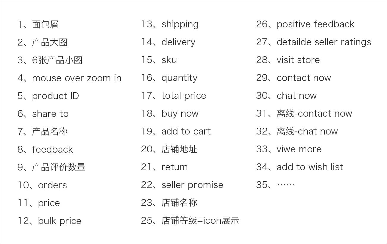 首先,我们把产品详情页所有的信息都罗列出来,有产品图片、产品SKU、产品所属店铺等信息,大大小小一共有30多条,这还不包括辅助性内容,如下图