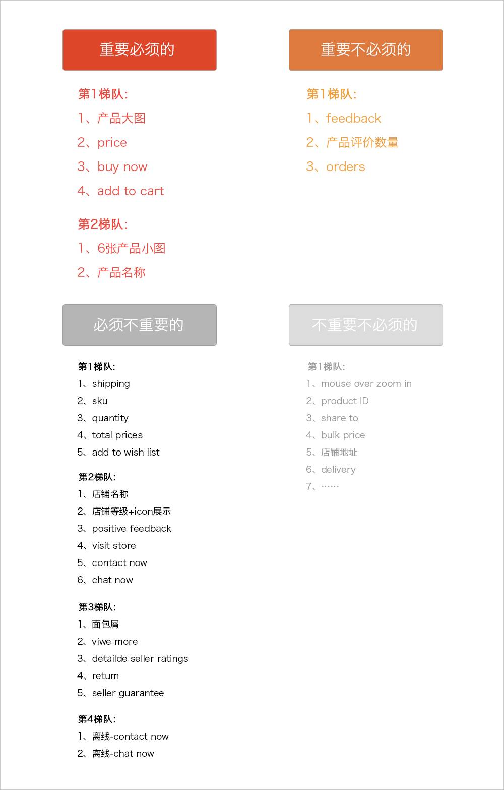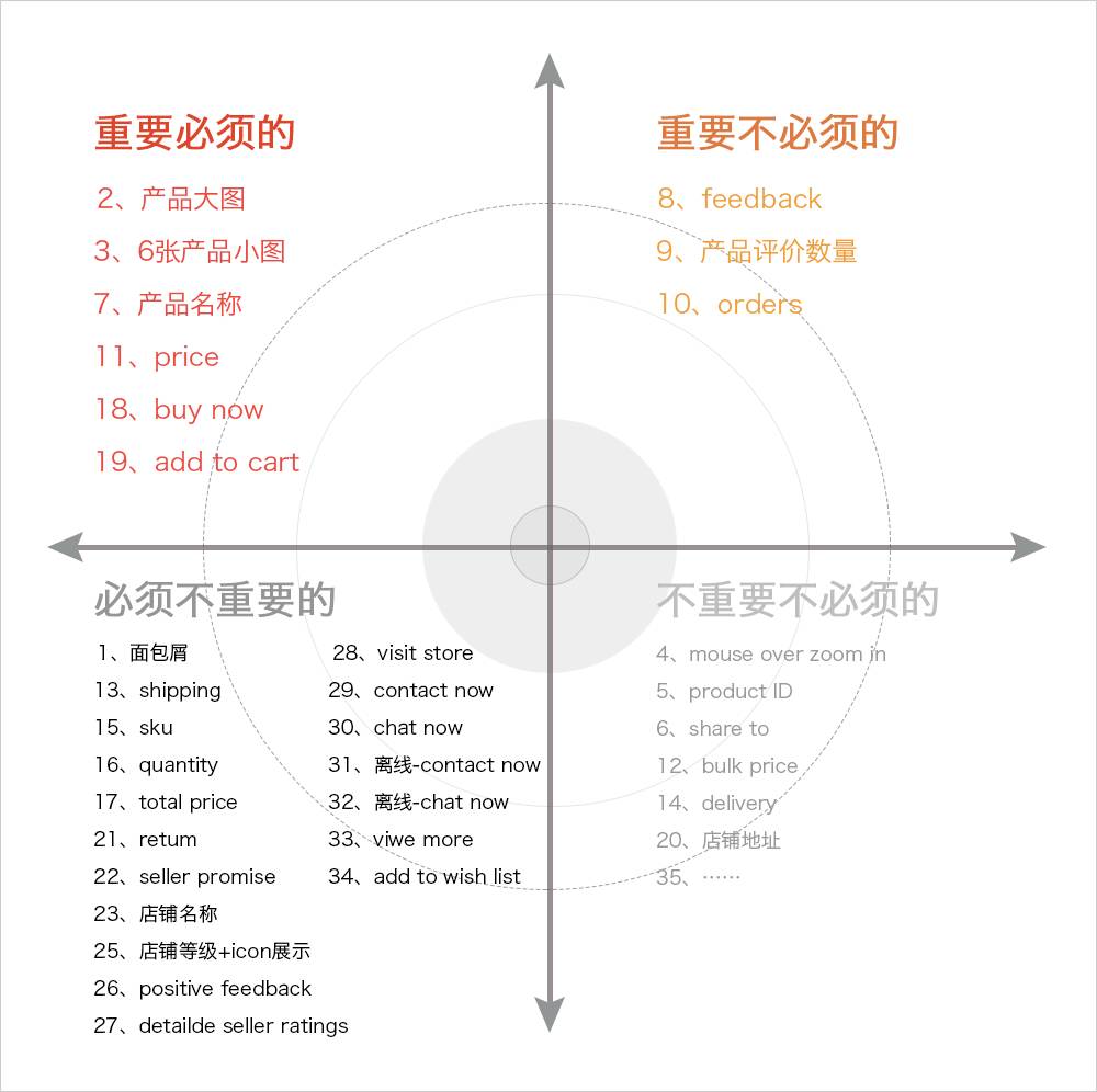 (注:这一过程会有些难度,可能会出现反复的情况,我们在做的时候,针对物流即shipping信息讨论了很久,因为物流很重要,但我们平台并没有物流优势,所以最终还是决定放在第三象限里,只要用户需要的时候能找到即可。)