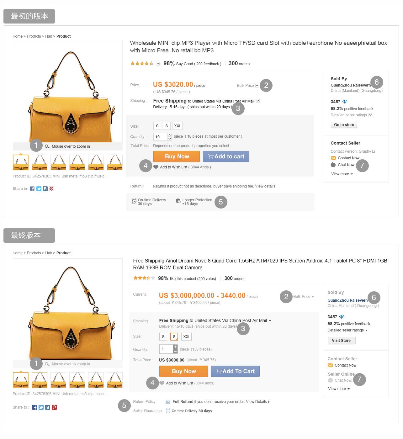 6 店铺名称:关于这个信息,最初的设计只是用了普通的黑灰色,但从卖家层面来说,从需求出发,是希望产品详情页能够给卖家店铺引一些流量,但又不能过于明显,还是以产品详情信息的展示为主,所以在最终版设计时就稍微强化了一下,采用深蓝的链接色;