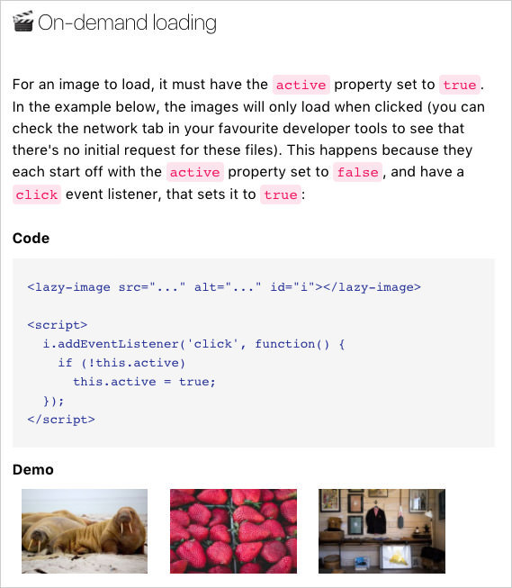 Lazy Image 是一个用来按要求加载图片的自定义 HTML 元素,这个自定义元素在元素对象中提供了一个附加的 .active 对象,可以在任何需要的事件或者用户交互中触发它。