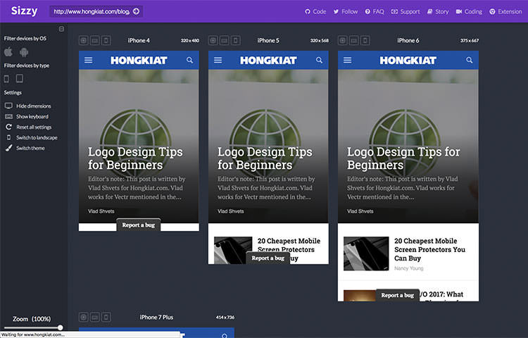 Sizzy 是一款用来测试响应式网站的开发工具,它可以帮你在一块屏幕上测试多个屏幕尺寸下的显示效果。比起Chrome 内容之的移动端模拟器,Sizzy 要方便太多。值得一提的是,它也是Chrome 浏览器插件。