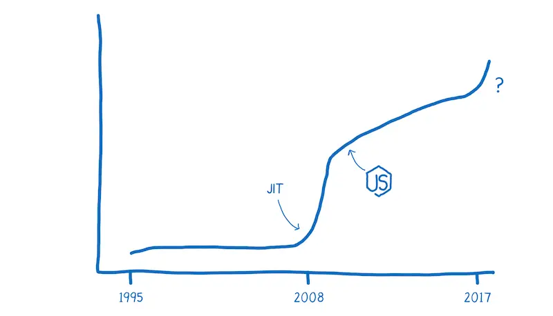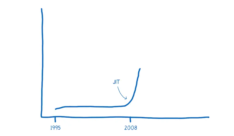 2008的这段时间,被称之为性能的起始阶段。多个浏览器增加了实时编译器,也就是JIT。在JavaScript运行时,JIT能够找到模式,并且基于这些模式让代码运行的更快。