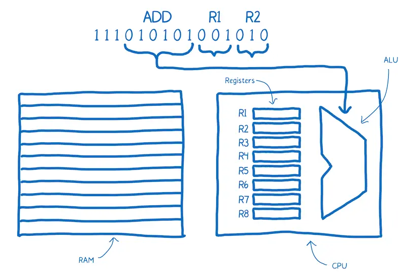 例如,大脑或许会将4~10位发送到ALU。ALU会基于0和1的未知判断出他需要将两个东西加起来。