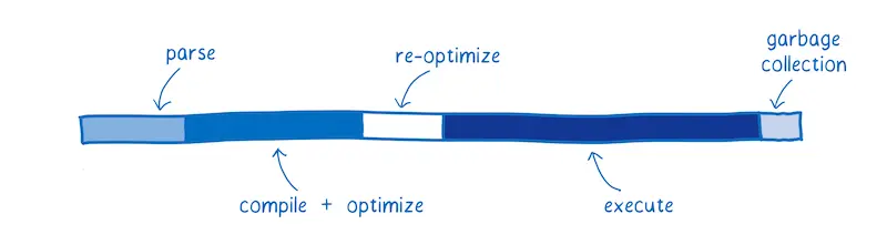 下图给出了一个理想应用中JS引擎所需要花费时间的地方。这个不是一个平均值。JS引擎执行其中步骤所需的时间依赖于具体页面上的具体类型的JavaScript代码。但是这个图可以给我们建立一个心智模型