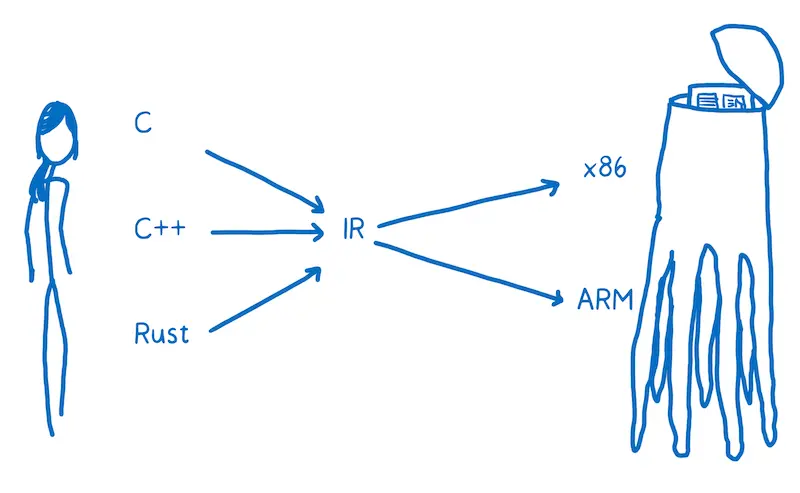 这样非常的低效。为了解决这个问题,大多编译器会在至少会在其中再放置一层。编译器会讲高阶语言转换成不那么高阶但也不是机器码这么低阶的东西。这些叫做中间语言(intermediate representation , IR)。