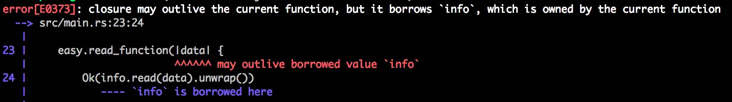 当然,由于这里的操作都是从标准输入输出中读取的,在回调闭包中,对外部变量的借用是不被允许的,在回调外定义一个数据,在读回调中使用时不允许的,就像这样: