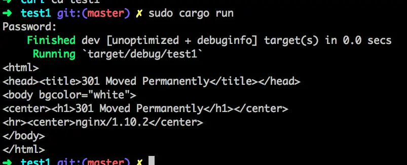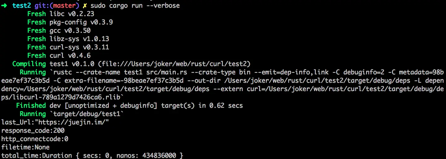 }这个例子中使用了curl库,并且使用了easy模块的命名空间,首先使用new函数新建了一个easy实例,然后通过url函数设置了访问的主机地址,然后继续设置了拉取到数据后的回调函数write_function,传入一个闭包函数,参数data即为服务器返回的数据,该闭包返回一个Result + Send + 'static,所以直接一条语句顺便输出了服务器返回的data,然后调用perform函数,让请求正式发出。结果如下: