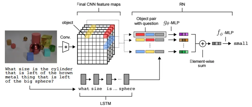 使用 RN 的网络可以处理桌子上的各种形状(球体、立方体等)物体组成的场景。为了理解这些物体之间的关系(如球体的体积大于立方体),神经网络必须从图像中解析非结构化的像素流,找出哪些数据代表物体。在训练时,没有人明确告诉网络哪些是真正的物体,它必须自己试图理解,并将这些物体识别为不同类别(如球体和立方体),随后通过 RN 模块对它们进行比较并建立「关系」(如球体大于立方体)。这些关系不是硬编码的,而是必须由 RN 学习——这一模块会比较所有可能性。最后,系统将所有这些关系相加,以产生场景中对所有形状对的输出。