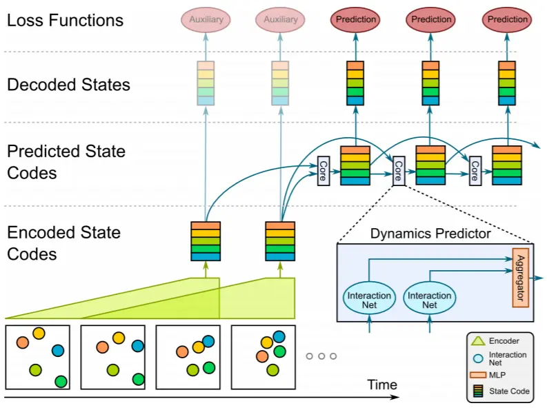 图 1:视觉交互网络:这里描述了一般架构(说明见右下角)。其中视觉编码器以连续帧的三元组为输入,并为每个三元组中的三帧输出一个状态码。该视觉编码器在输入序列上以一种滑动窗口的形式工作,然后得出一个状态码序列。应用于该编码器的解码后的输出上的辅助损失(auxiliary losses)有助于训练。然后该状态码序列被馈送入动态预测器,其包含多个交互网络内核(本例子中是 2 个),这些内核工作在不同的时间偏移(temporal offsets)上。然后这些交互网络的输出被送入一个聚合器(aggregator),以得到下一个时间步的预测。这个内核以一种滑动窗口的形式工作,如图所示。其预测的状态码是线性编码的,然后在训练时被用在预测损失中。