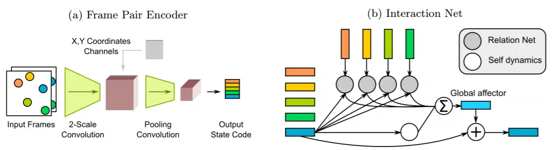 图 2:帧配对编码器(Frame Pair Encoder)和交互网络(Interaction Net)。(a)Frame Pair Encoder 是一个 CNN 网络,可将两个连续输入帧转换为一个状态码。在池化(pooling)处理成单位宽度和单位长度之前,重要特征要与 x,y 坐标轴相关联。池化后的输出被重塑成一个状态码。(b) 通过动态预测器的处理,交互网络(IN)可以被应用到每一个时间偏移当中。每一个 slot 都有相应的关系网络,这可以使每个 slot 都和其他 slot 相互关联。而且每一个 slot 本身又都应用了一个自动态网络(self-dynamics net)。这两种输出结果通过变换器(affector)被累加求和,并且进行后期处理(post-processed),从而预测出新的 slot。