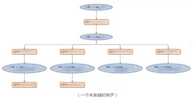 这里面采集到的路径会非常多,比如一个日报可能访问的是昨天某一个表的数据,比如访问量,就需要访问昨天的分区。采集出来的数据路径粒度非常细,它是包含日期的。但是我们关注点并不需要到分区,我们关注的是表本身。所以我们把涉及到日期相关的路径规约掉,转成与日期无关的路径,数据规约对关系链分析有好处,归完之后减少了很多的数据量。我们把最基础的信息采集到,它描述了一个任务,访问什么数据,产生什么数据。经过我们的逻辑采集完之后,我们得到的是最原子的数据访问关系,就是一个任务对存储的操作,读或者是写,我们会产生非常多这样的原子关系,这种关系累计的结果就是关系链。我们清洗出来一个最基础的关系,可以拼凑成一个大的关系链。