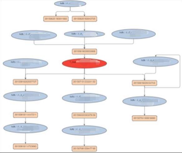 我们需要知道数据流是怎么样来的,比如上面的一个关系链中,入库任务对最顶层的 HDFS 数据做一些加工处理,处理之后把结果保存到入库表;分析人员基于这个入库表做各种计算和统计分析,比如统计某些指标,做关联性分析,这里配置了四个任务,这四个任务运行后产生新的结果表,其中还有两个结果表由下层的任务做进一步的处理,这样就产生了数据和任务的关系链。引入关系链模型,它能帮助我们理清楚数据和任务的关系。我们用椭圆描述数据,矩形描述对数据的加工,他们的连线表明访问数据的方向,是读还是写。这个关系可以用来指导我们的数据迁移,可以做到数据在哪里,计算就在哪里。