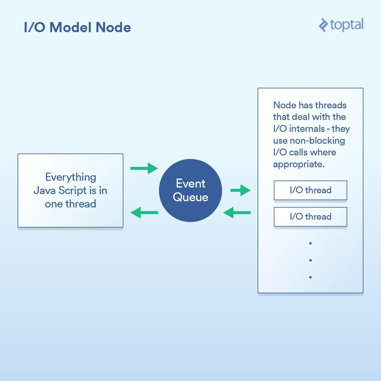 虽然Node确实可以有效地处理I/O,但上面的例子中的for循环使用的是在你主线程中的CPU周期。这意味着,如果你有10,000个连接,该循环有可能会让你整个应用程序慢如蜗牛,具体取决于每次循环需要多长时间。每个请求必须分享在主线程中的一段时间,一次一个。