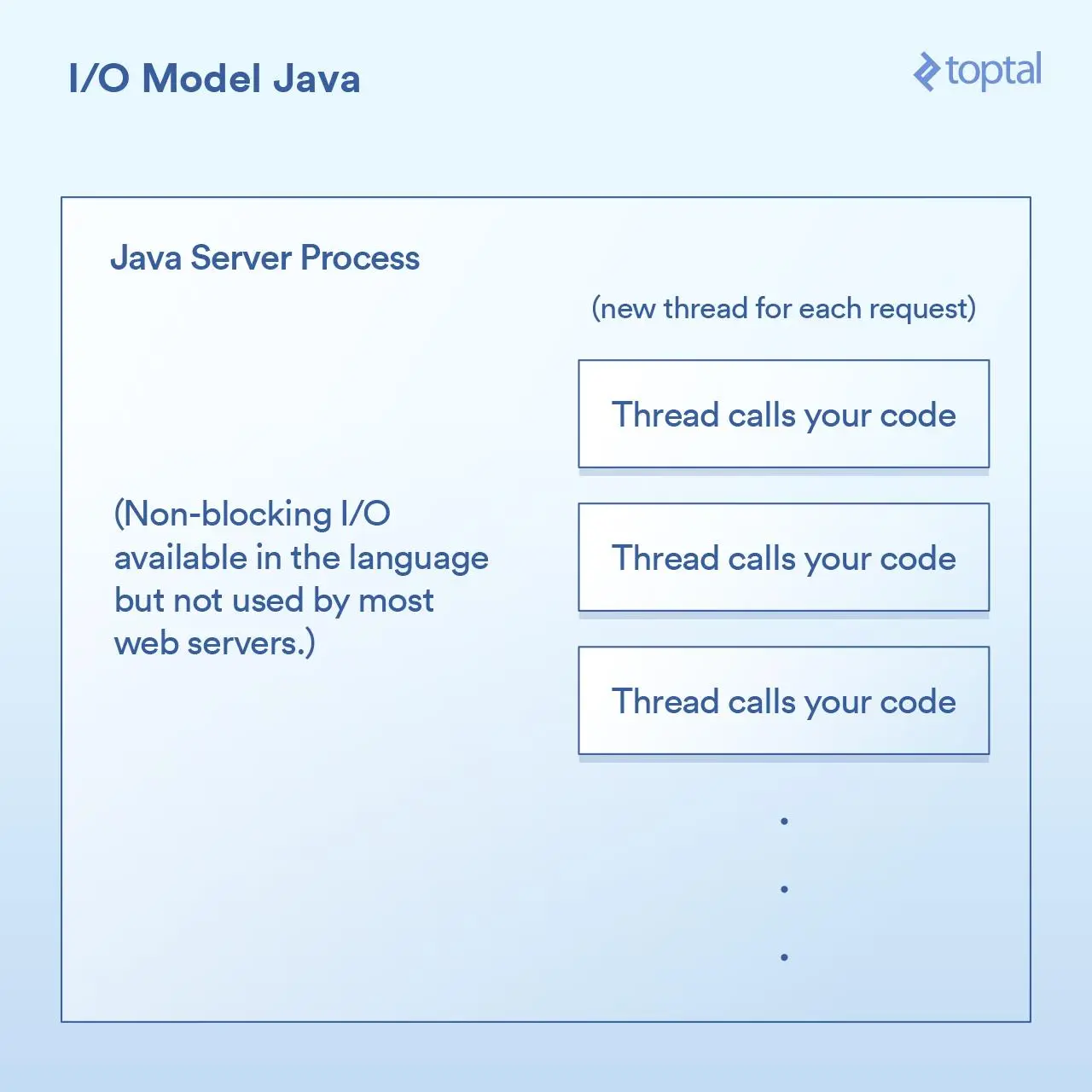 一个重要的里程碑是,在Java 1.4 版本(和再次显著升级的1.7 版本)中,获得了执行非阻塞I/O调用的能力。大多数应用程序,网站和其他程序,并没有使用它,但至少它是可获得的。一些Java网站服务器尝试以各种方式利用这一点; 然而,绝大多数已经部署的Java应用程序仍然如上所述那样工作。