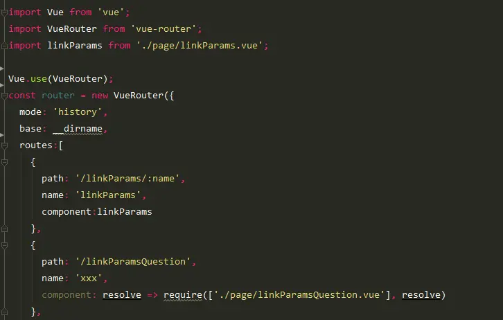 懒加载的方式,我们就不需要再用import去引入组件了,直接如下即可。懒加载的好处是当你访问到这个页面的时候才会去加载相关资源,这样的话能提高页面的访问速度。component: resolve => require(['./page/linkParamsQuestion.vue'], resolve)