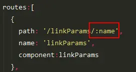 首先在路由配置文件router.js中做好配置。标红出就是对 /linkParams/的路径做拦截,这种类型的链接后面的内容会被vue-router映射成name参数。