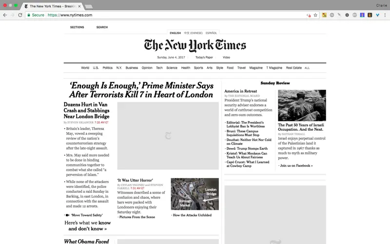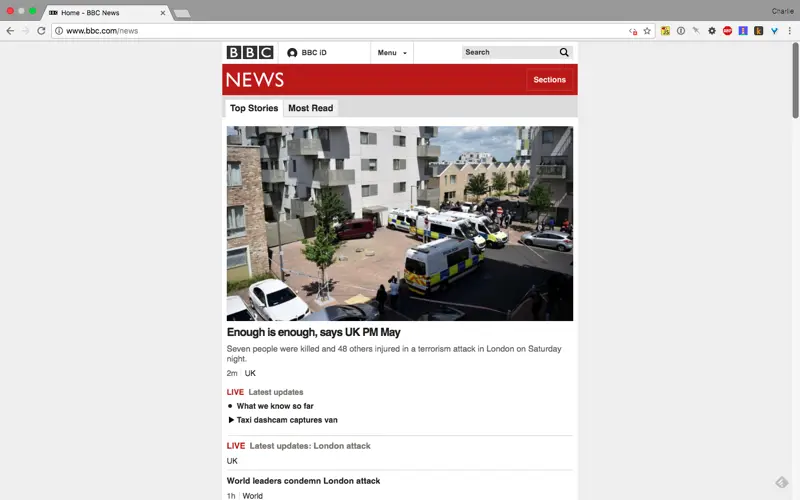 It’s the day after the latest London terrorism attacks, and so I’ve got this open, just to see how the media intensifies and aids every terrorist action. The BBC is the inventor and poster-child for progressive enhancement via Cutting the Mustard, and it doesn’t disappoint. The non-CTM site works fully and while it doesn’t look the same as the full desktop site (it’s mobile-first and so is pretty much the mobile version), it still works.